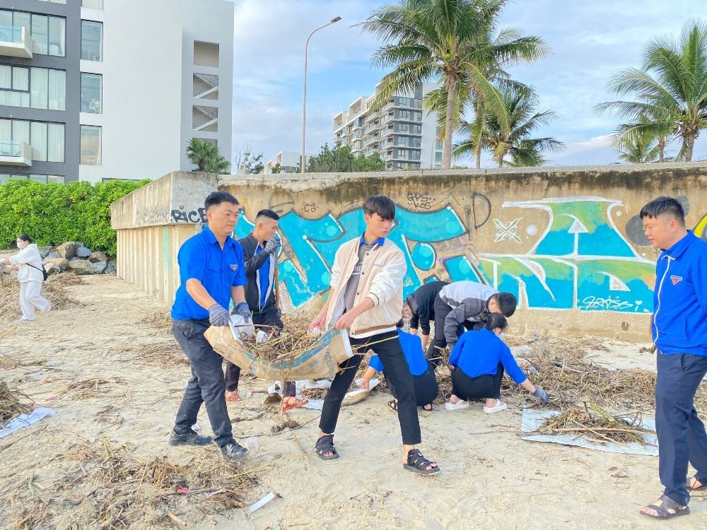 Thanh niên dọn rác sau lũ ở bãi biển Đà Nẵng